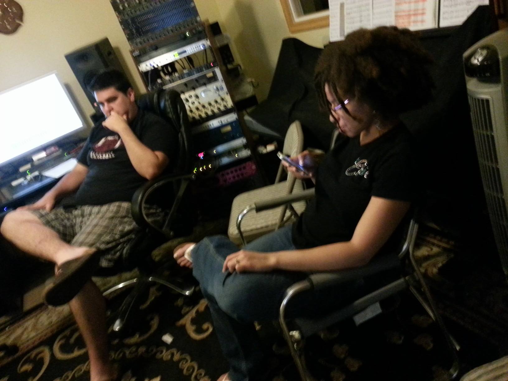 Shana ChrisWe also need to take a moment to talk about our recording engineer, Chris Wright. Seriously–this dude is very, VERY good at his job. He is worth every penny of our travel expenses. We can’t see him when we’re in our recording booths, but we hear him (and Richard) through our headphones and he navigates his space-aged recording software like nobody’s business. Richard says something like, “can we take them back two lines and have them hear that…” and within moments we’re listening to that exact spot. Chris is also a barbershop-brat so he has an amazing ear for things. We’ll be kicking along and he’ll say, “Hold on one second, I want to check the quality on the such-and-such part….” Besides the technical skills, he is super chill. He has the kind of personality you need on a project like this. There’s enough pressure in the situation, so you wouldn’t want a recording engineer without a high degree of patience! He’s a great guy. And since the quartet already has a Chris and a Kris, we’ve decided to distinguish by calling ourselves “Adams,” “Lewellen,” and “boyfriend.” It’s quite amusing when Richard refers to Chris Wright as “boyfriend.” Just sayin’.