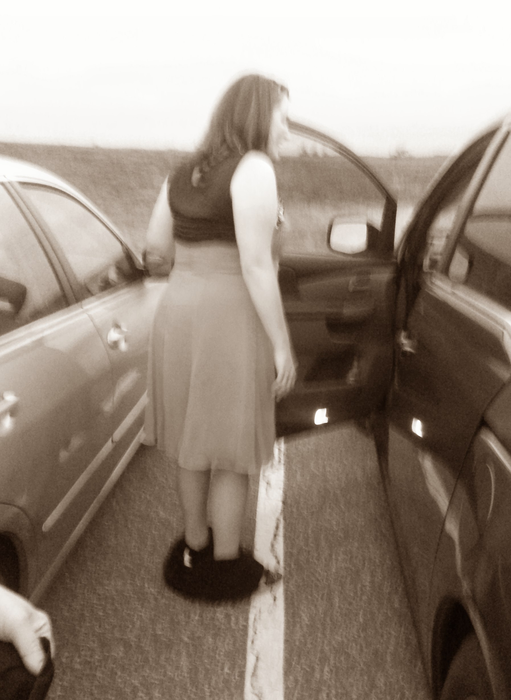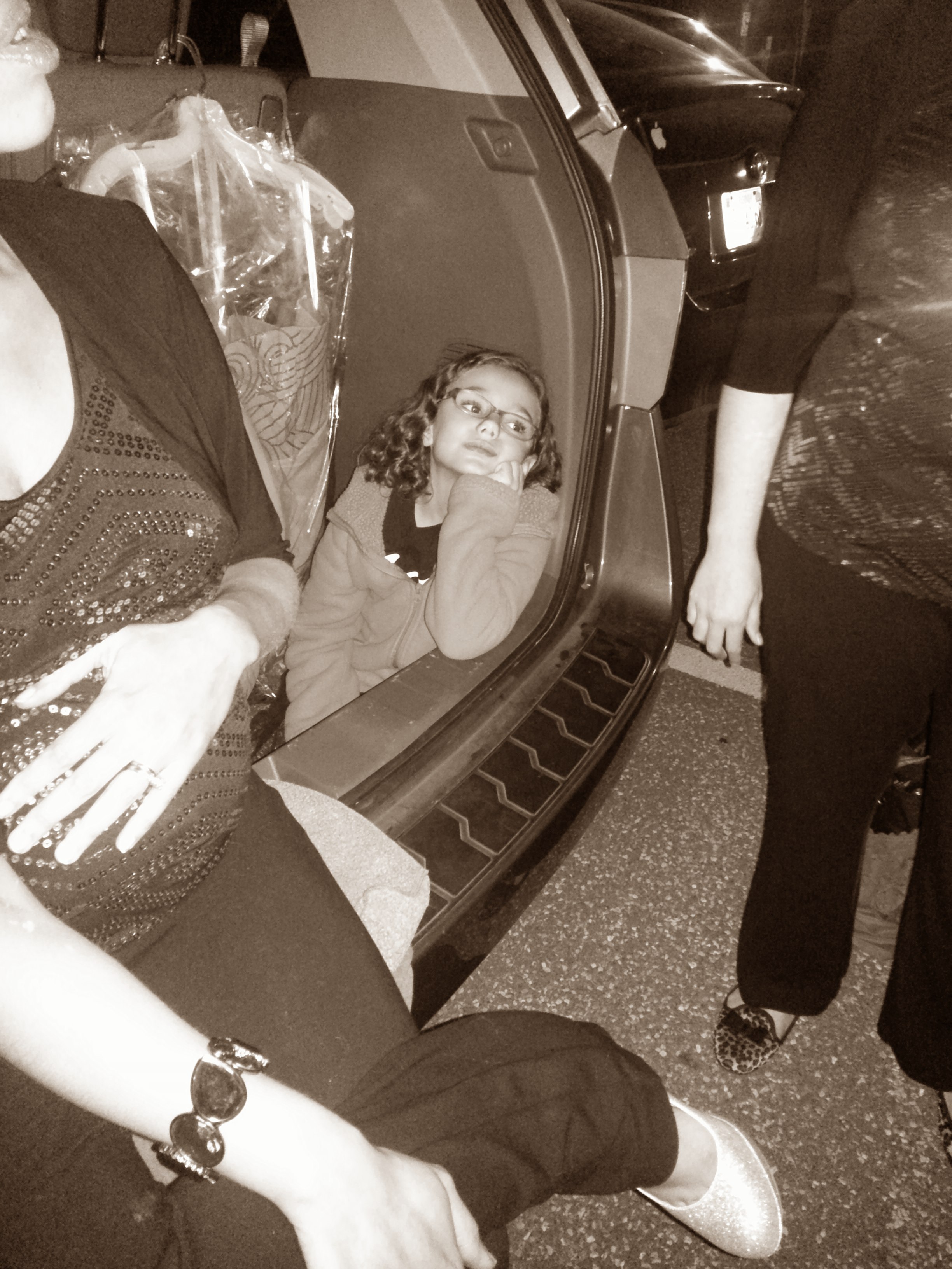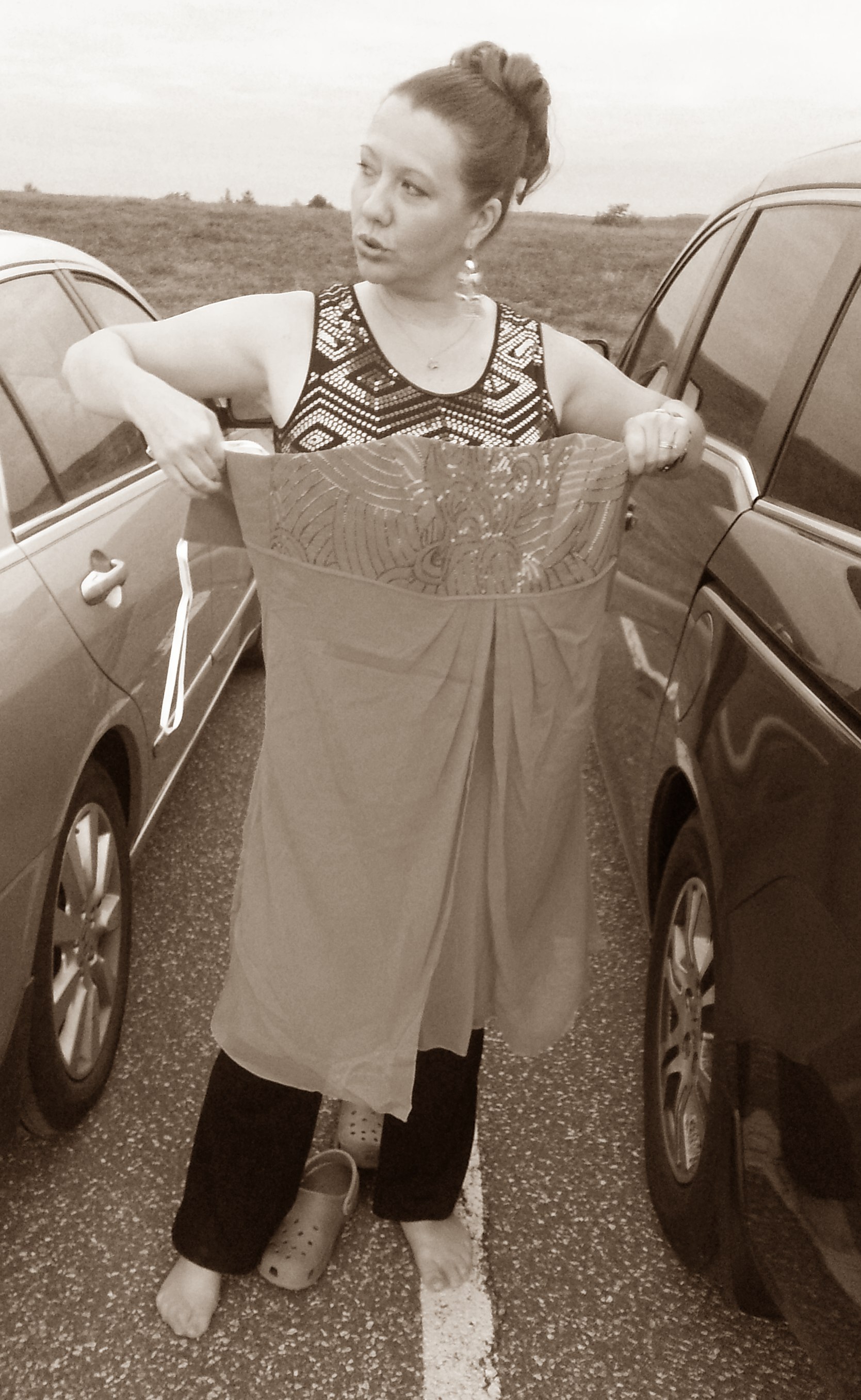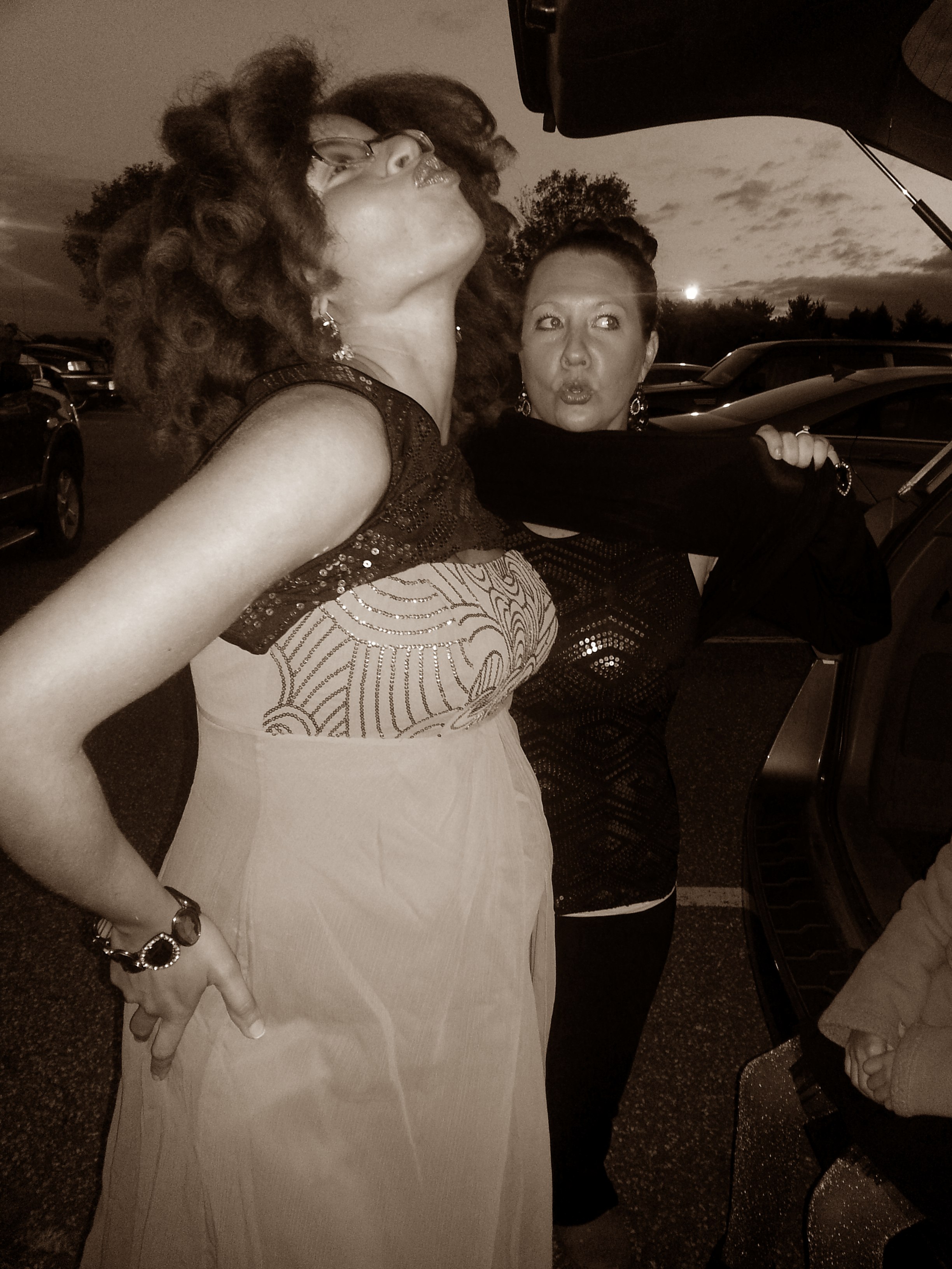 So at the gig, Epic looked far and wide for a restroom or a dressing room that wasn’t full of the men in the other chorus singing on the show. Alas, there was no such restroom or changing room. But business had to get done–there were new dresses to try on. So with a soccer field full of men playing in the background, Epic decided that trying on costumes in the parking lot was a perfectly acceptable approach to this monumental challenge.