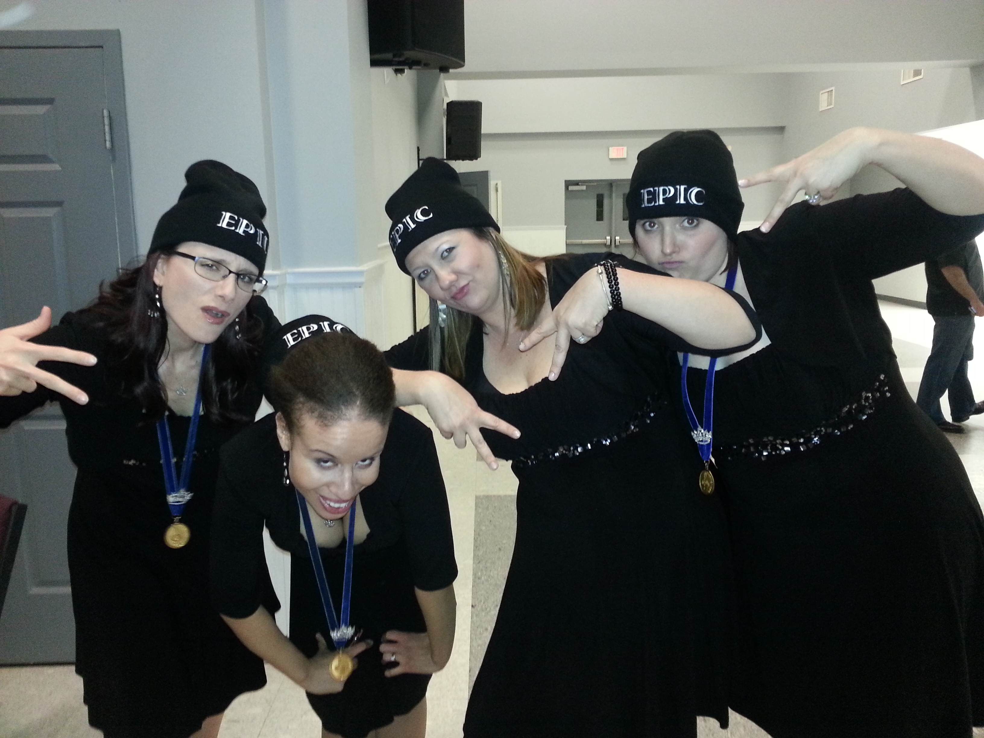 And this coming weekend, we have another milestone event on the books. You’ve probably heard us say this before, but in that first fall we were together, we had a show contract on our calendar before we even had two songs. That supportive and trusting chapter that hired us for the following spring, sight unseen (or maybe sound unheard), was the Fairfax Jubil-Aires, and now we’re excited to be appearing on the Fairfax chapter show for the third year in a row. But since Epic never offers up a “vanilla” experience, we’re going to do this year’s performance with some guest singers. Anne (our lead) is on her way to a Disney Cruise with her family right now, so we’ll be singing with Carter and Ashley from Speed of Sound–9th place medalists from Sweet Adelines. We love these ladies to BITS and we can’t wait to hit the stage with them. Since they are much sweeter than Anne, we promise not to do rude things to them while we’re on stage and we won’t make them sit in a time-out chair for messing up all the talk spots.